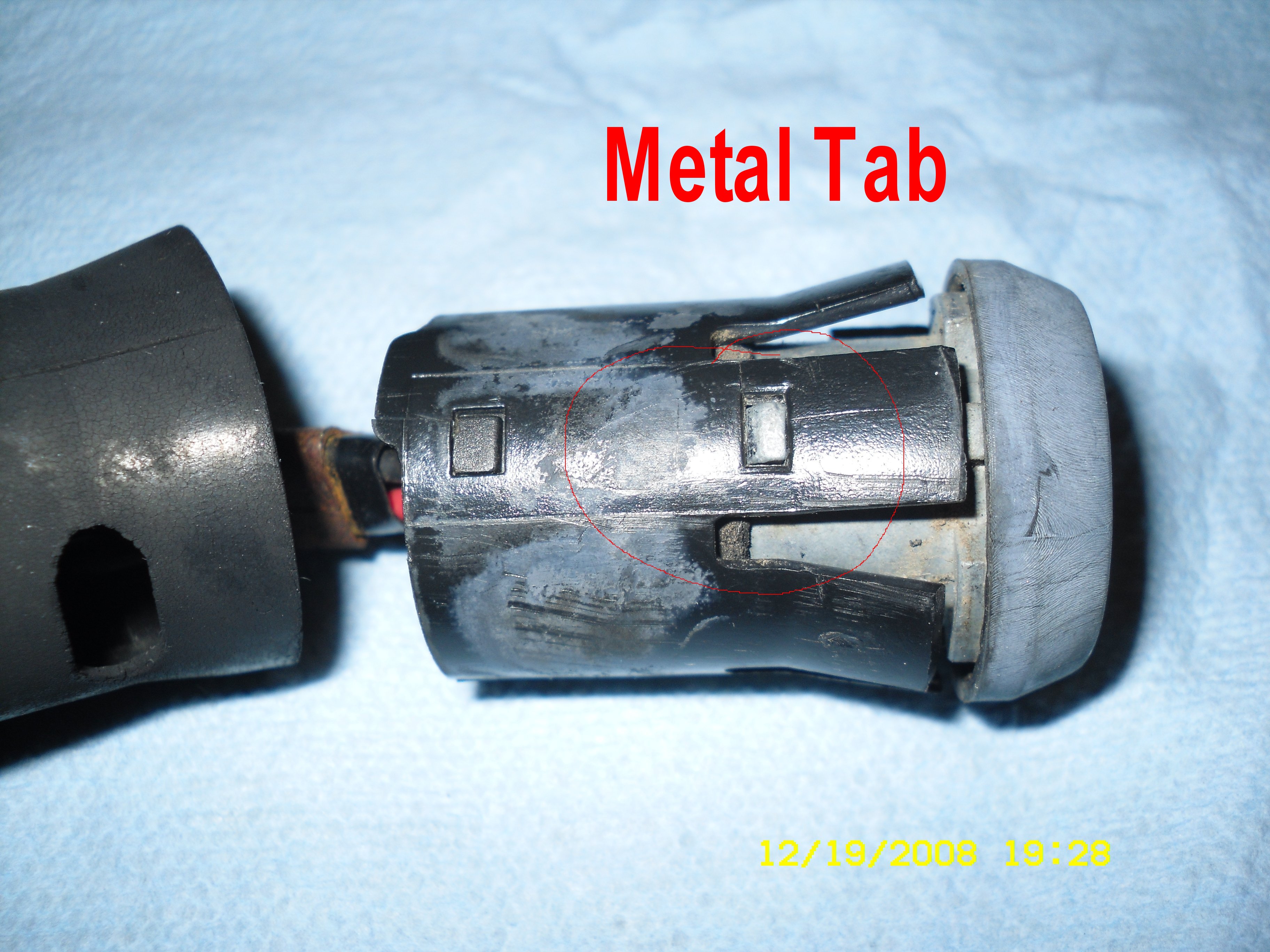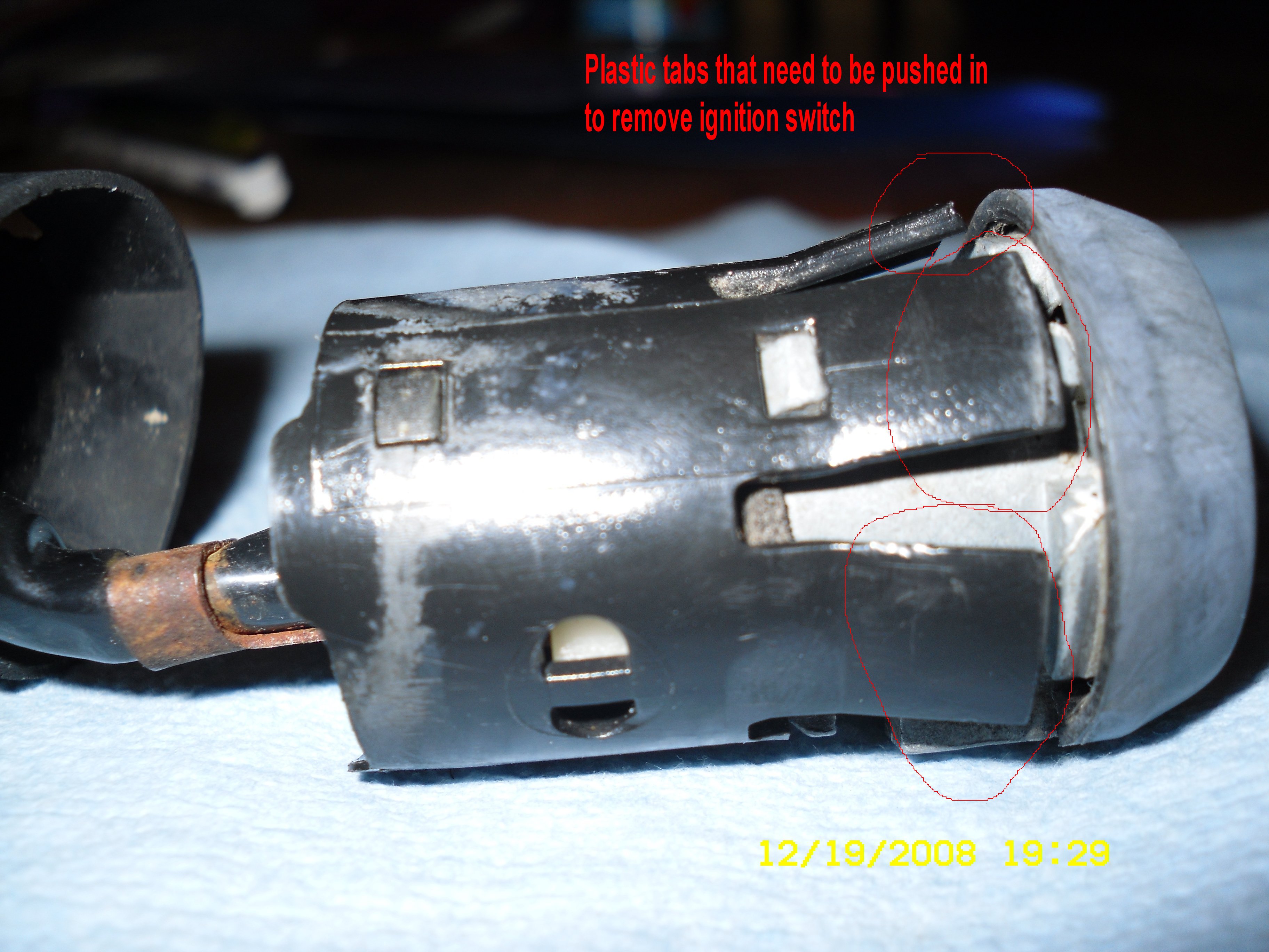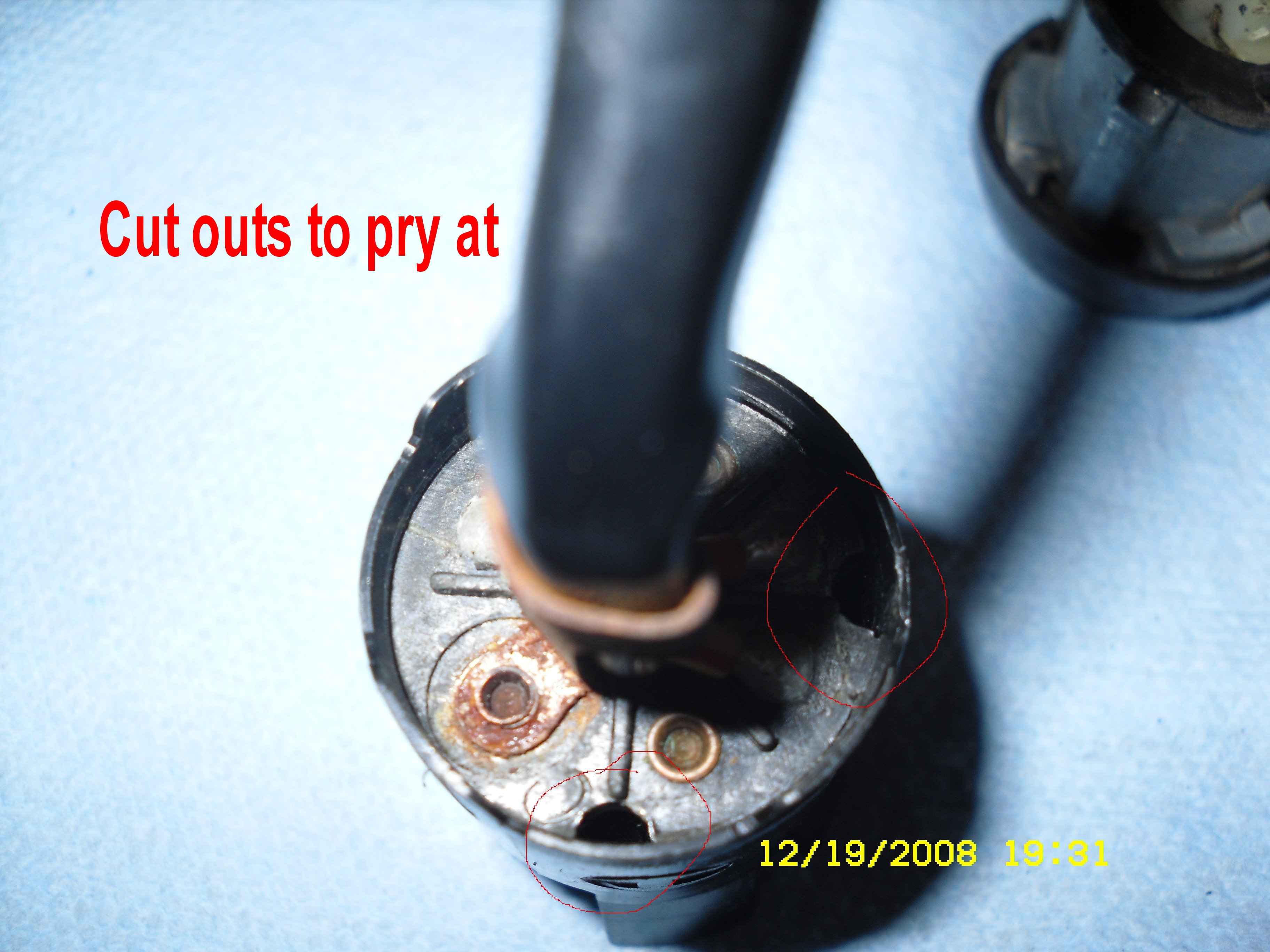Now we need to remove the bottom section of the ignition where the contacts are. There are 3-4 plastic tabs that hold the bottom area on. you will need to coordinate a prying and pulling action to remove it from the pin section from the switch.