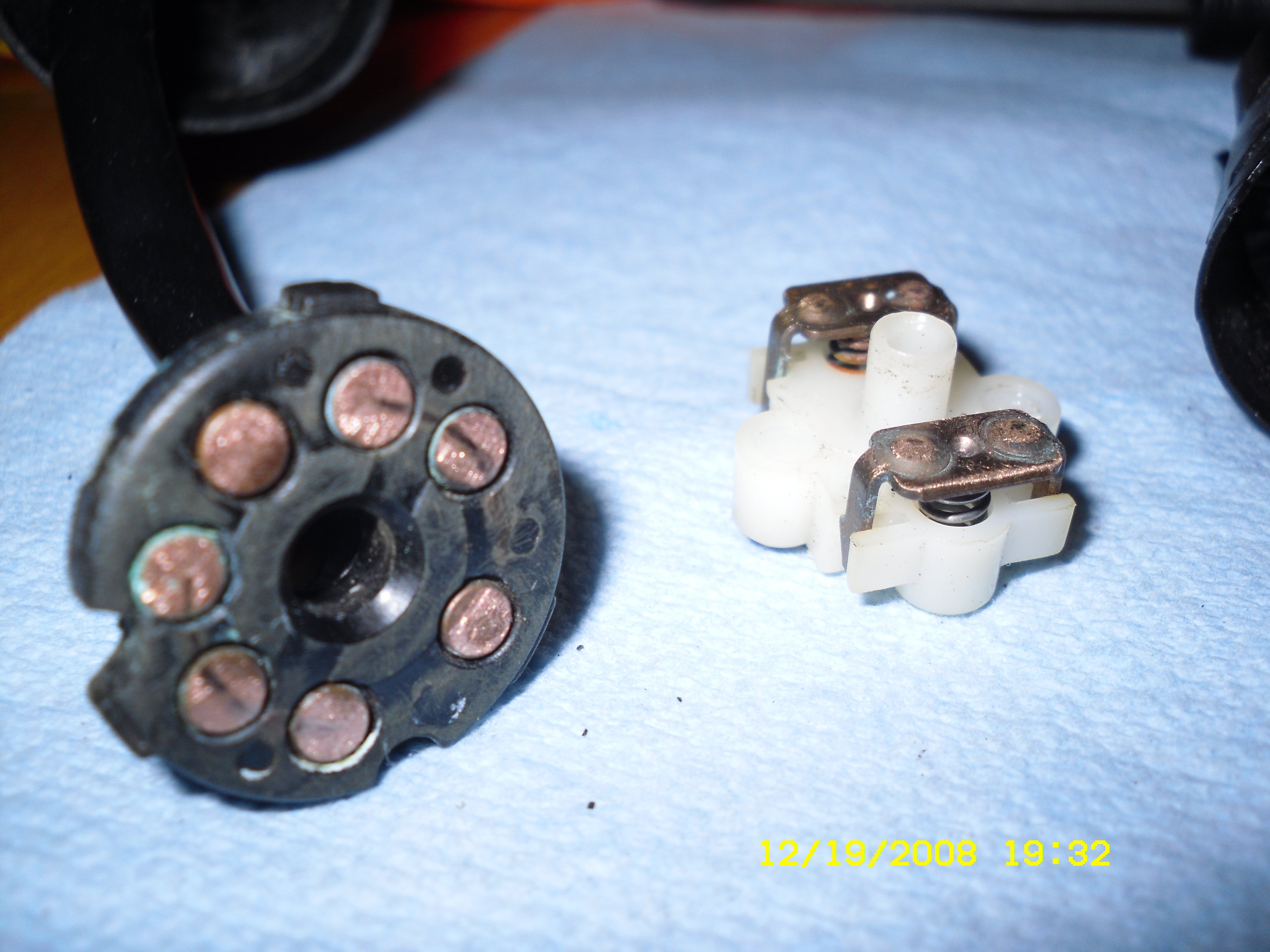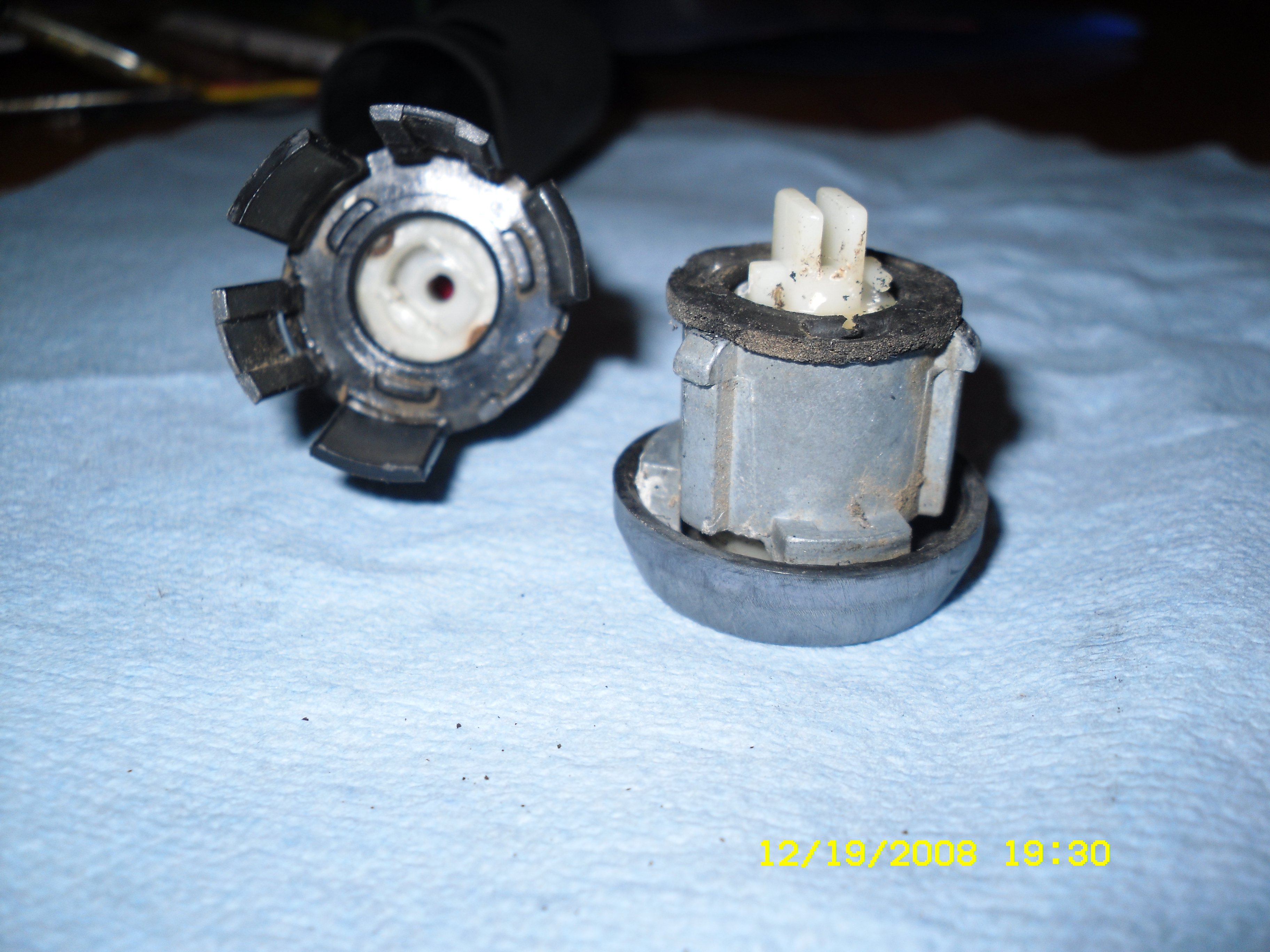 Once you have removed the bottom section you will see 2 pieces. 1 is a plastic piece with 2 2-pointed copper nubs that are attached to springs. This is the part that turns with the key itself. those nubs contact the pin section and allow for power to be applied to the Trike's ignition and starter relay. You need to take some mid level grade emery cloth sand paper(200+ grit is what I recommend) and hose the connections down the sand the corrosion away so it's nice and shinny and copper looking again.