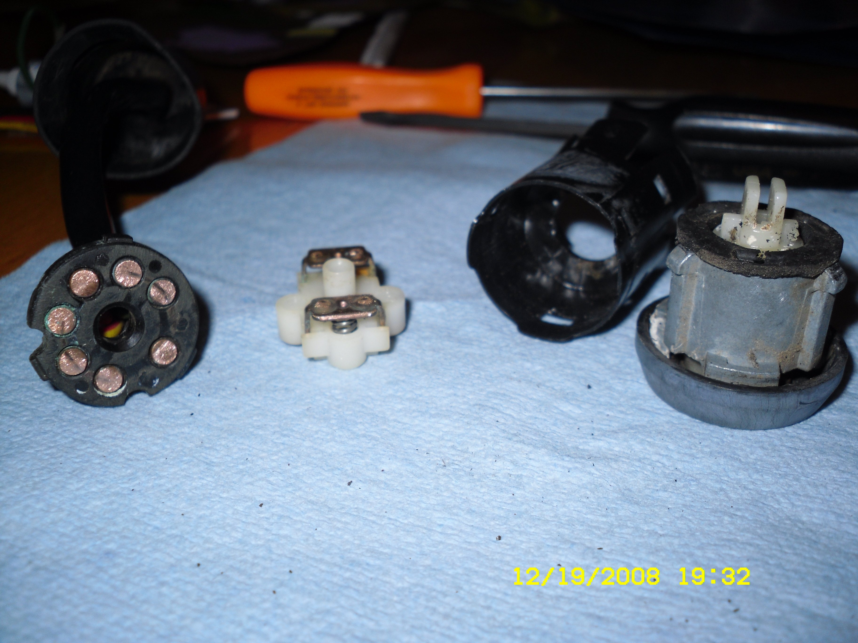 Before you put it back together your going to need to go to the auto parts store (unless you already have some) and purchase a very small tube of dielectric grease. You will need to lube the bottom of the key area, and both metal contact areas and the pin areas. Also if you need to solder some wires back on, before assembly is the time to take care of that.